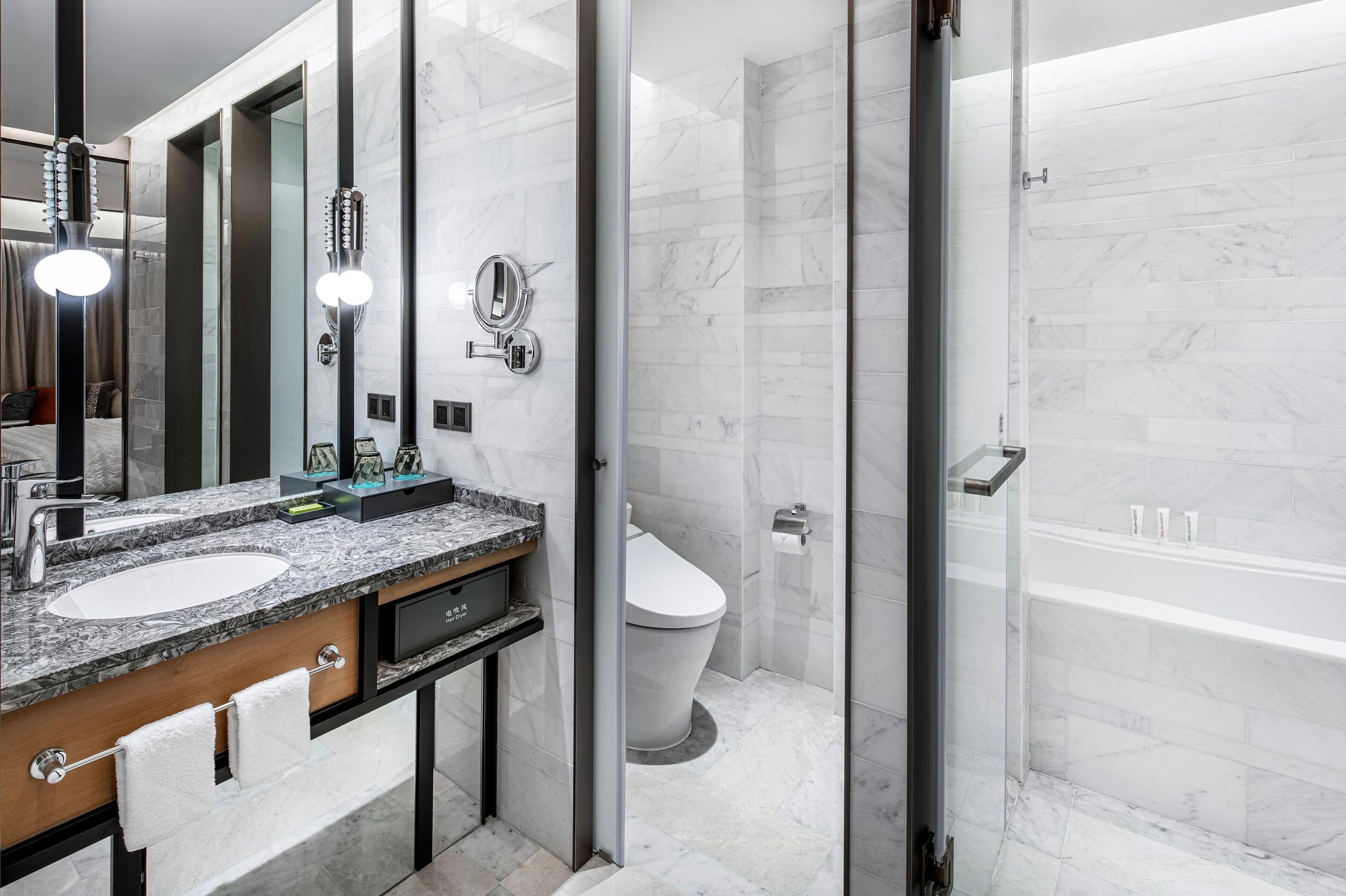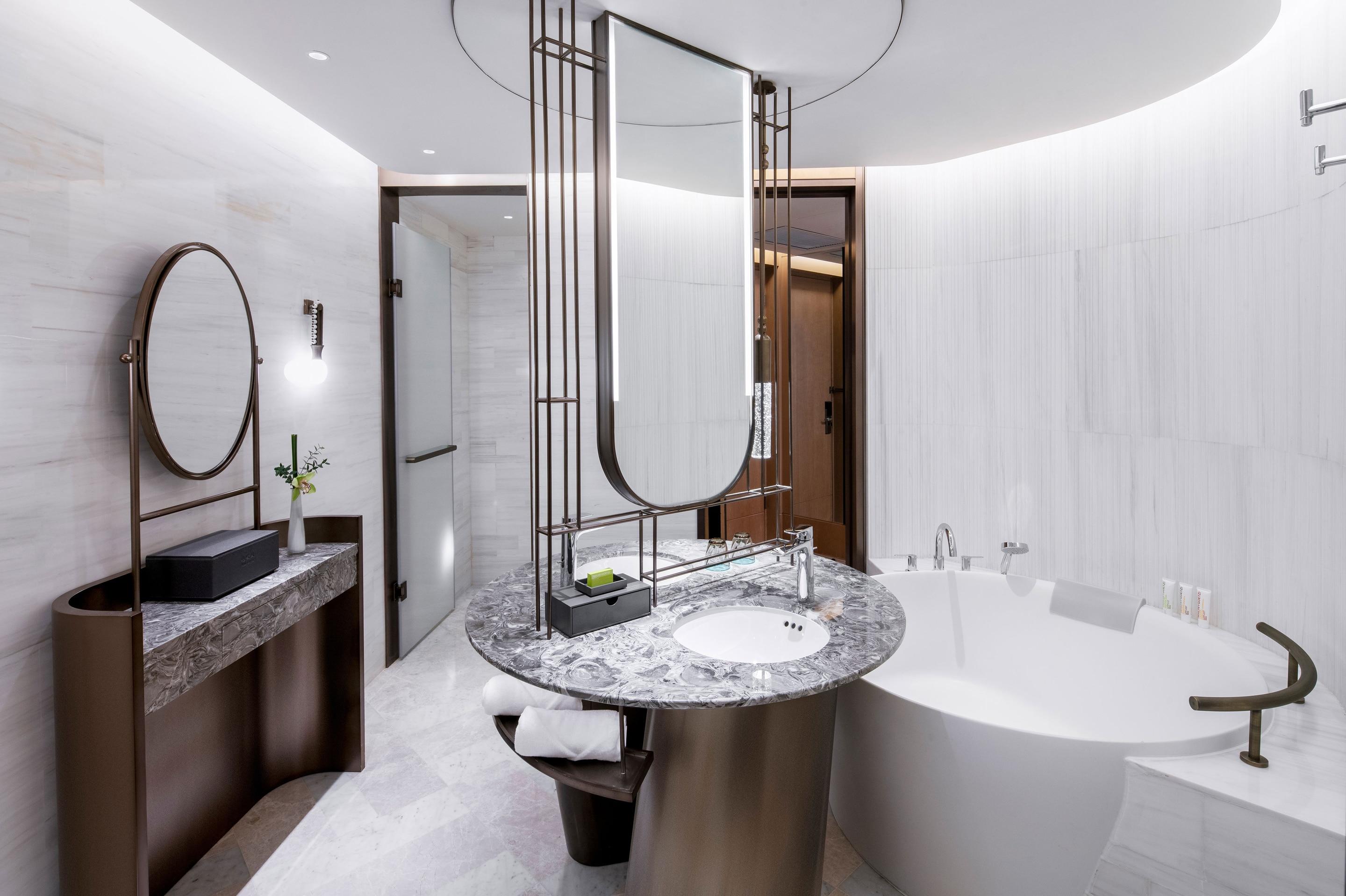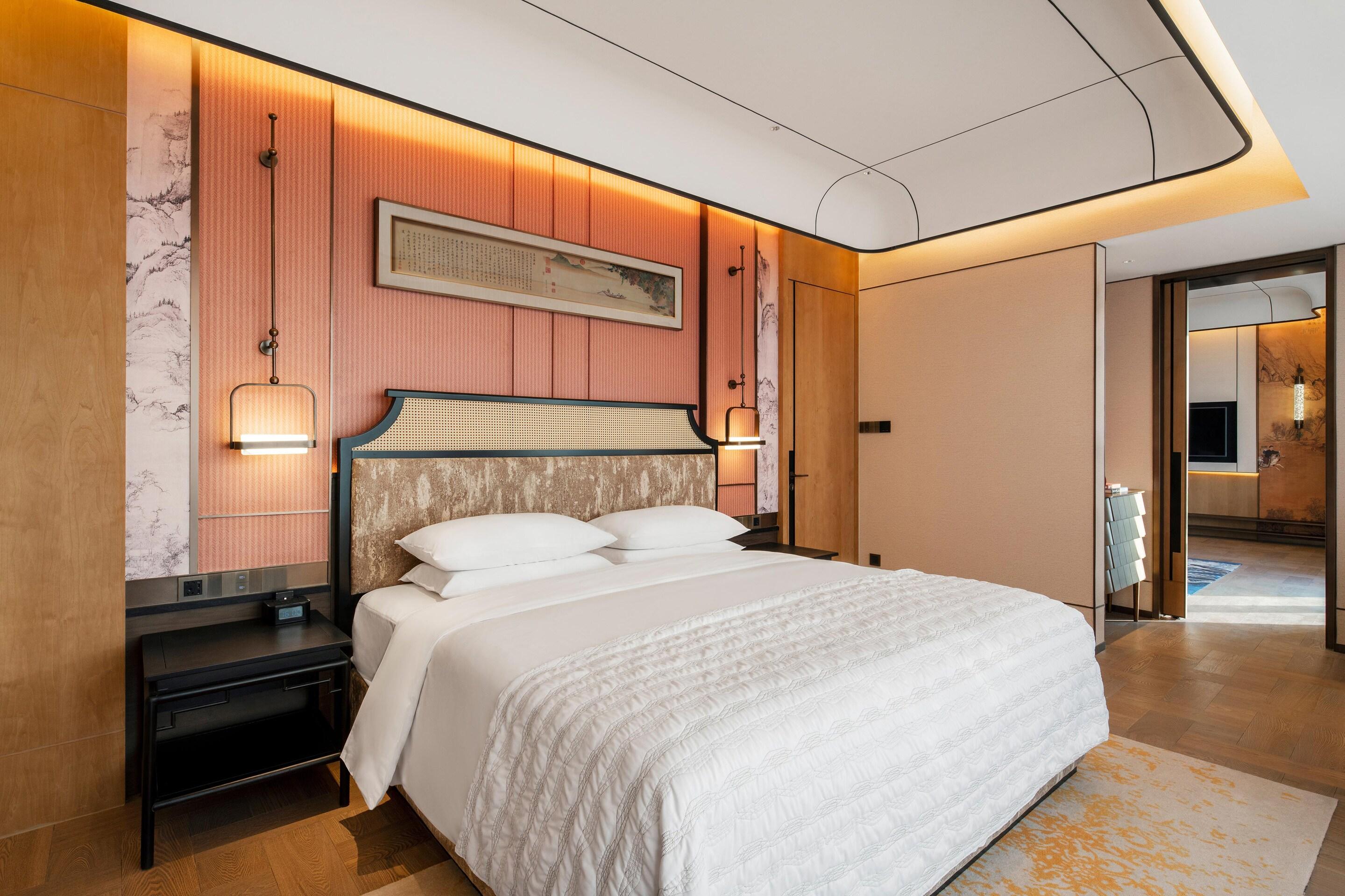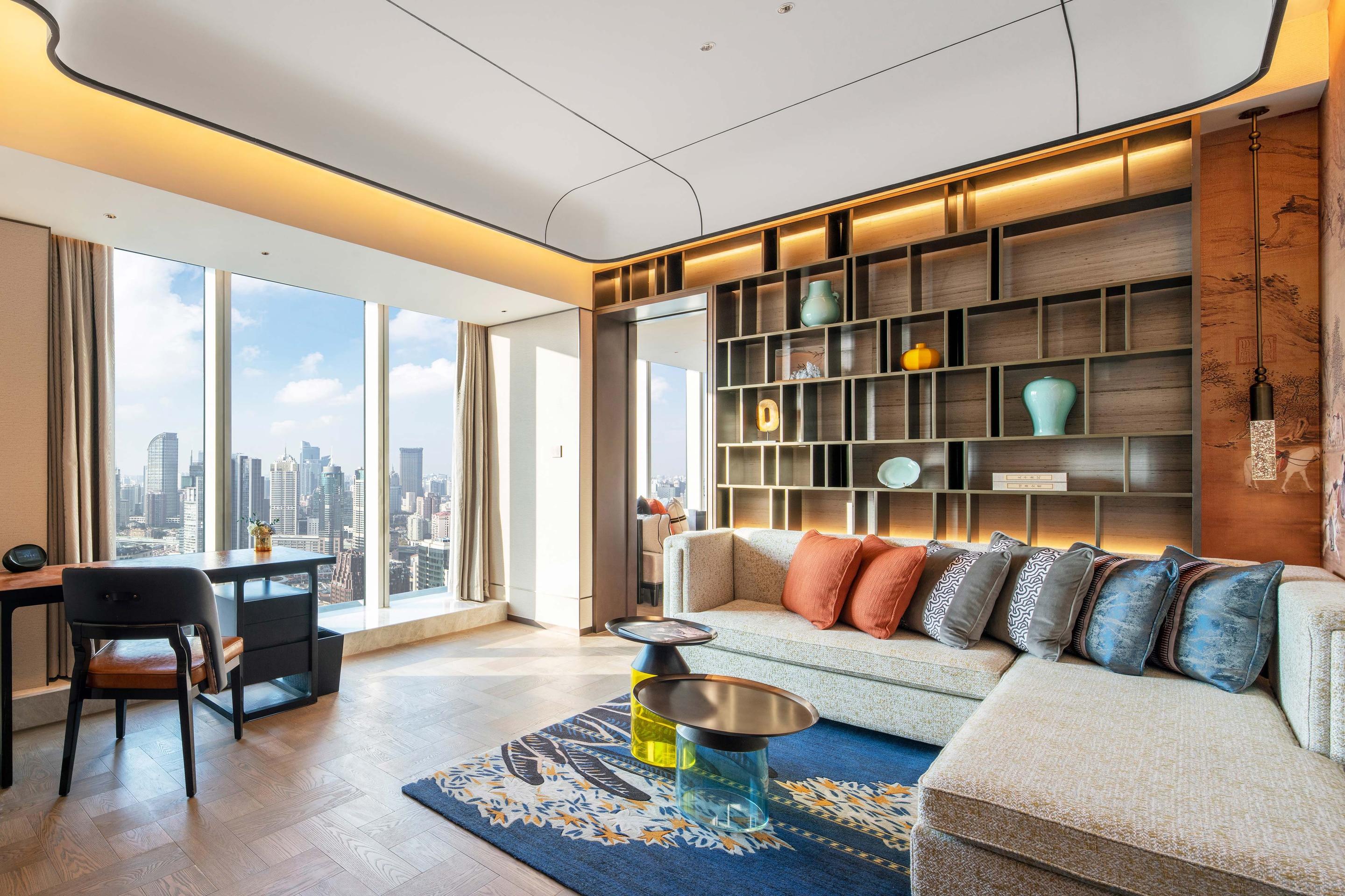 墻面懸掛的扇形山水田園畫引人遐想,時尚與典雅相結(jié)合。大面積落地窗將魔都夜景盡收眼底,是夢幻,是迷人。